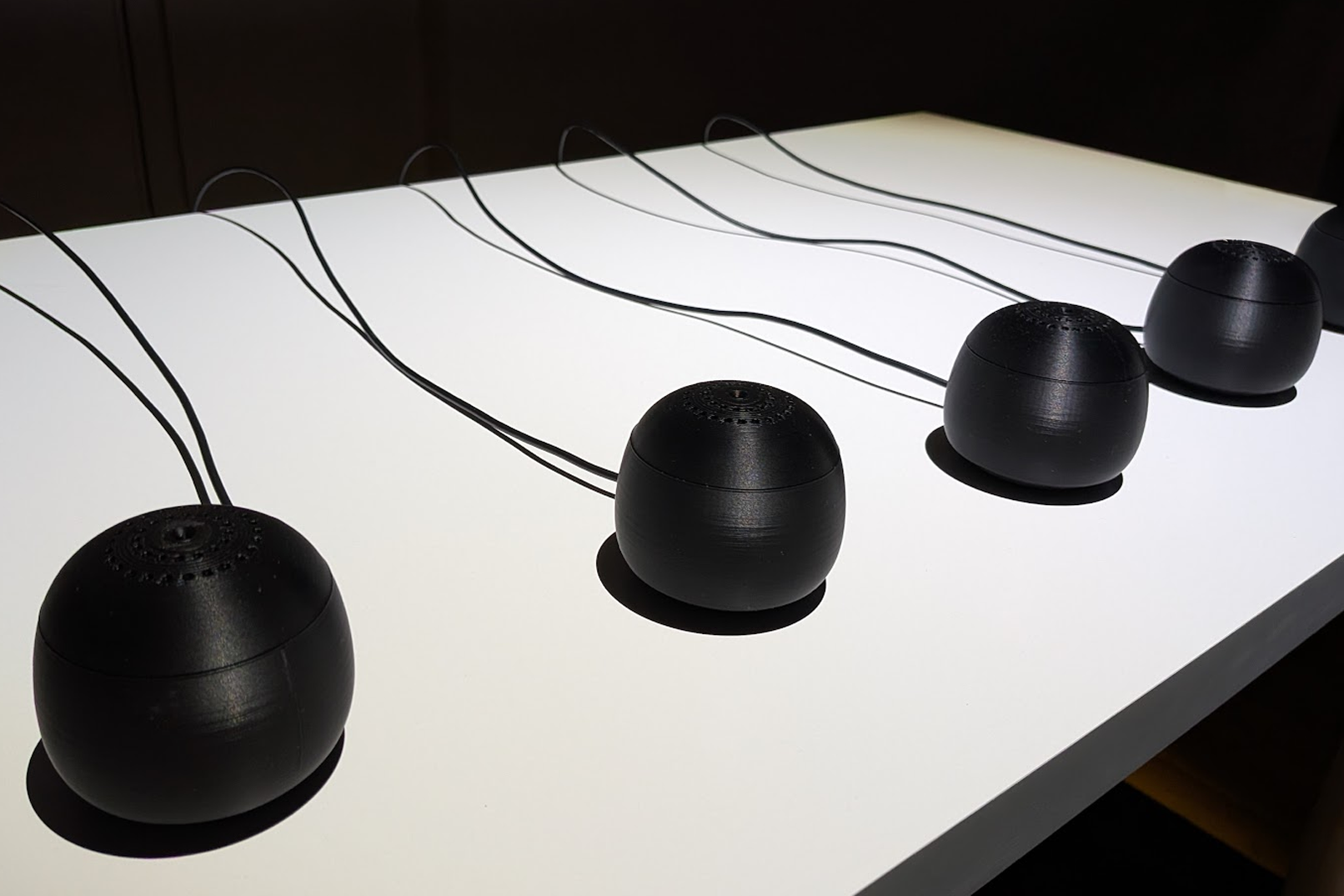 Within this context, Sound Swarm presents a distributed field of autonomous sonic nodes. Each sustains a single tone. There is no melody or rhythm; instead, harmonic presence reorganizes through asynchronous swells and spatial repositioning. Visitors shift the topology of the system, and the sound field quietly reconfigures in response—an acoustic ecology shaped by proximity, listening, and collective interaction.