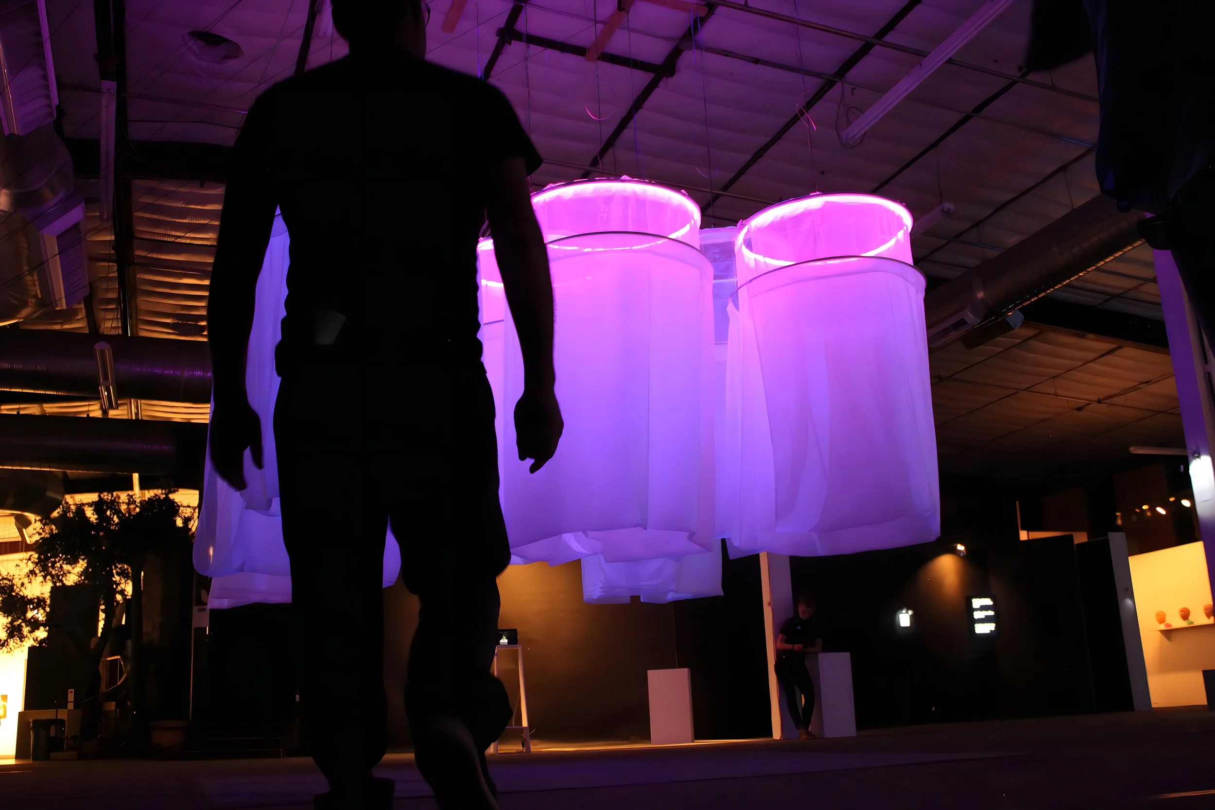 As visitors wander through the artwork they discover that their presence affects the motion of the sculpture: cylinders become taller or shorter, and colors start to morph and animate. The motion of people, fabric and light appears as a dynamic, colorful, organic form. When no one is interacting, the sculpture moves slowly on its own.